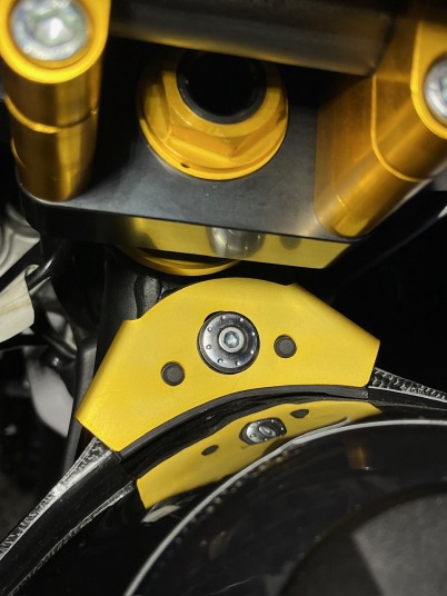 純正スプロケットカバーの泥はけとフレームガードの大型化によりフレーム下部もしっかりガード出来る様新たなデザインで製作致しました。フレームヒールガードは皿キャップボルトとシフトボルトを使い埋込タイプでブーツとの干渉を無くしライデングを邪魔しない構造となっています。